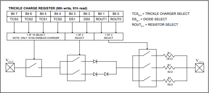 Also assume that the trickle charger has been enabled with one diode and resistor R1 between VCC2 and VCC1.